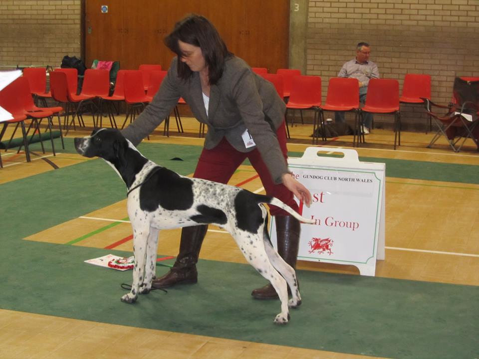Strong head with well developed neck & shoulders, ribs of good proportion & depth, correct rear angulation & tailset all mounted on tight well trimmed feet. Moved around the ring with grace.