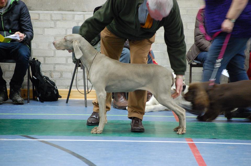 Good sized, fit, scopy black who I have admired from ringside previously & who is still quite babyish but with lovely clean lines & Labrador type. His head has matured since I first saw him but still has loads more work to come no doubt – he has age on his side. With his super length of leg & lovely neat, well padded feet, his gleaming harsh double coat & good reach of neck, he has a look of quality about him. I’m sure he has a promising future ahead of him!